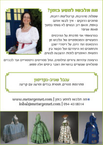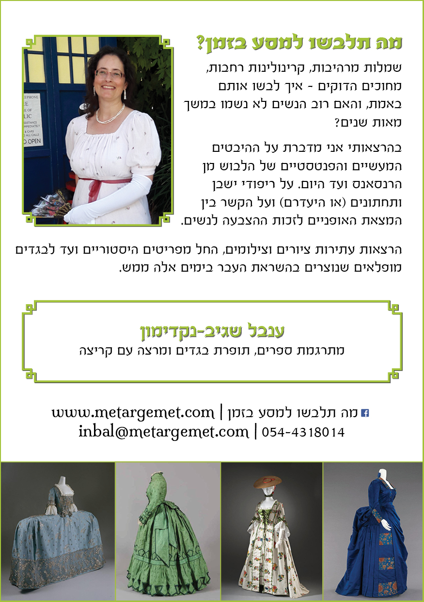 התחדשתי בעלון פרסומת להרצאות שלי על תלבושות. אתם מוזמנים להעביר את המידע למקומות ואנשים שמזמינים הרצאות. אני מפרסמת הרצאות פתוחות לקהל כאן, וגם בדף הפייסבוק שלי, “מה תלבשו למסע בזמן?”