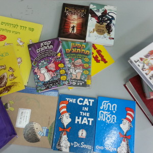 בתור דוגמה בסיסית ביותר, ומוכרת לכולם, הראיתי לילדים את הספר “The Cat in the Hat” מאת ד”ר סוס באנגלית, ולצידו התרגום לעברית של לאה נאור: “חתול תעלול”. דיברנו על הדימיון והשוני ביניהם: כיוון הכתיבה השונה של שתי השפות מחייב פתיחה הפוכה של הספר, ולכן גם הציור על הכריכה הפוך בכיוונו.