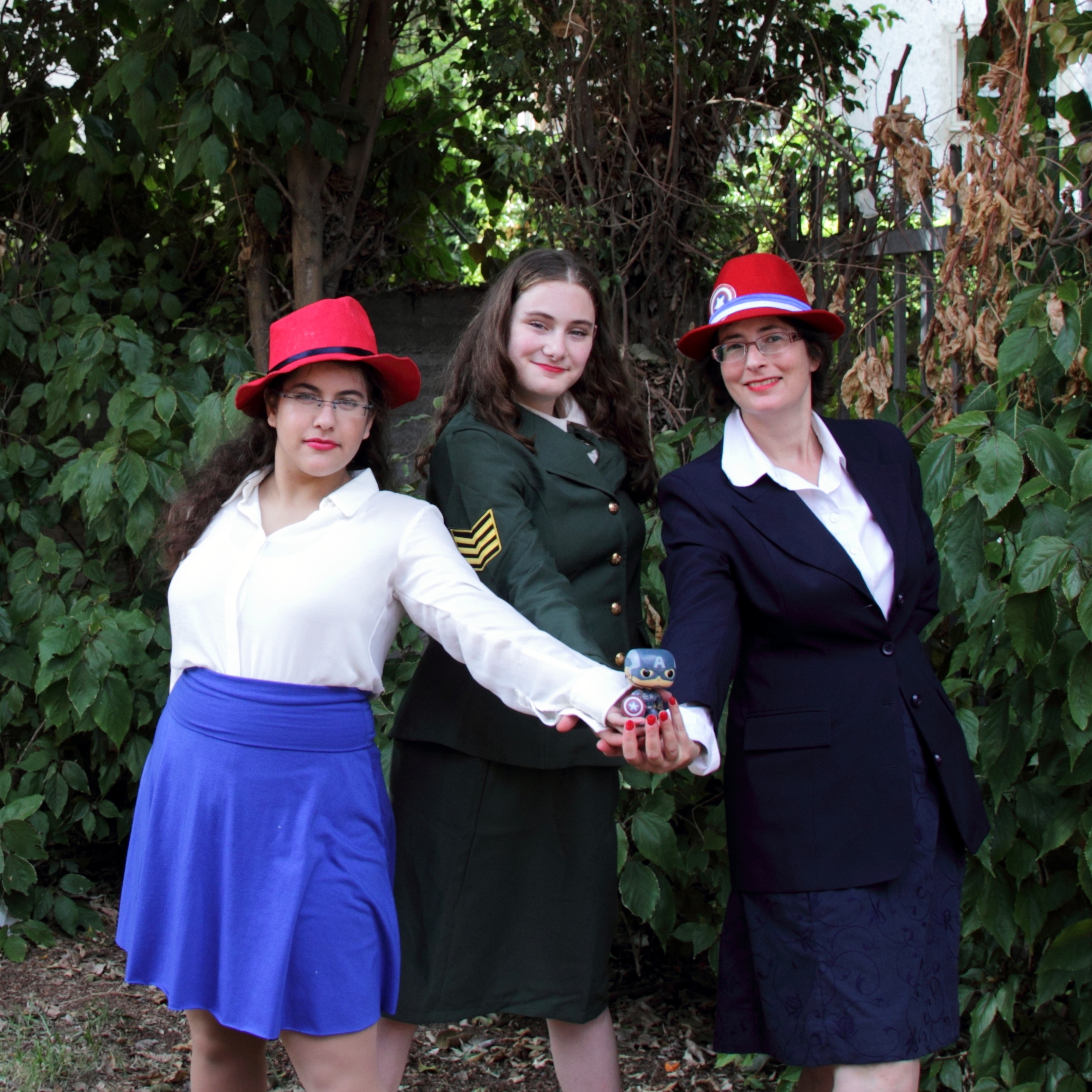 בצילום: היבט שלא הגענו לדבר עליו בפאנל, אבל לדעתי יש לו קשר לפאן-פיקשן כתוב, הוא קוספליי – תחפושת המבוססת על דמות מסרט, סדרת טלוויזיה, משחק מחשב, קומיקס וכן הלאה. בשנים האחרונות הכנסים מלאים תלבושות נהדרות ומושקעות. כאן אני בתלבושת של פגי קרטר, מסדרת הטלוויזיה “הסוכנת קרטר”. איתי עוד שתי בנות-דמותה ואנחנו מחזיקות בובה של קפטן אמריקה.